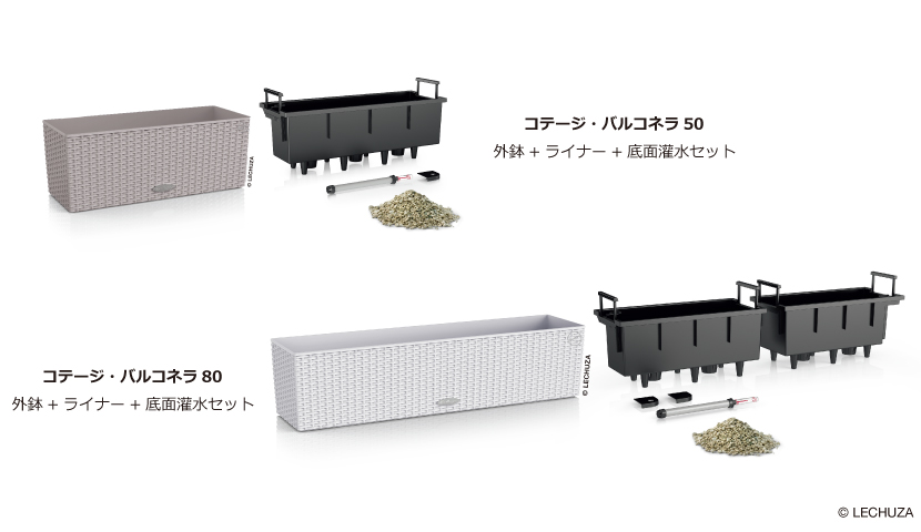| セット内容 | バルコネラ80・本体 / 底面灌水一体式ライナー×2 / Lechuza-PON(クレイ)×2 / 説明書 |